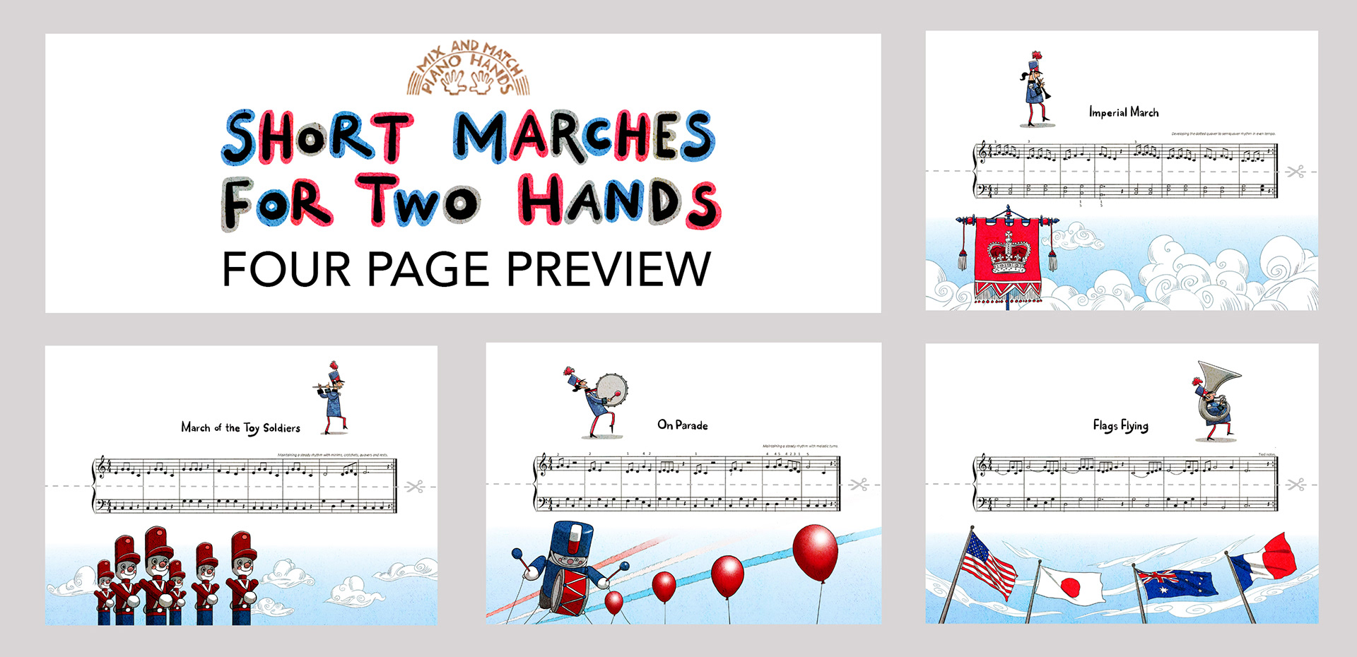 Short Marches for Two Hands is a Mix and Match Piano Hands book consisting of a suite of stirring march styles with a wider melodic range, complex rhythms, musical ornamentation and other notational features to fascinate and engage piano players.