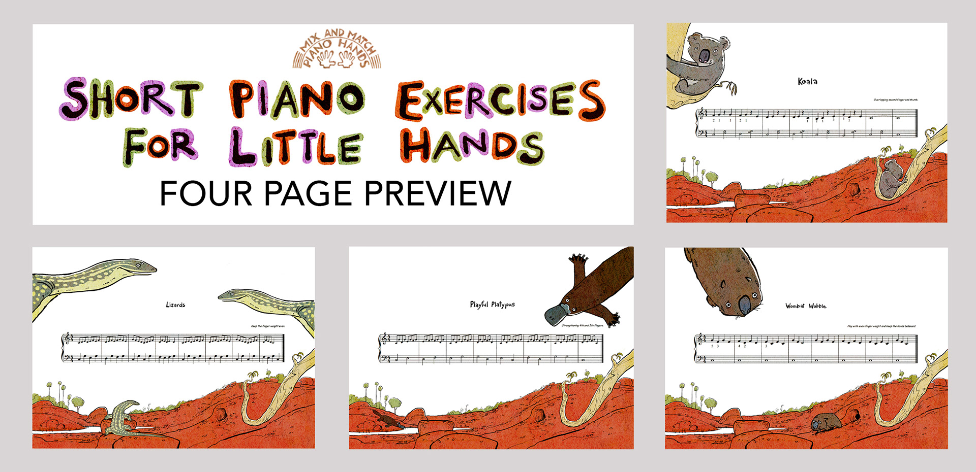 Short Piano Exercises for Little Hands is a Mix and Match Piano Hands book. The exercises are mainly based on five notes, C – G for each hand, with 1-5 fingering, and patterns which develop the muscles in the correct way and encourage the practice of essential performance skills. These basic exercises develop an excellent technique for young players. Written by Catherine Le Brun and illustrated by Peter Sheehan, this 30 page, A4, coil-bound book contains 10 short piano pieces that can be mixed and matched to make 100 different combinations for young children. It is the second book in the Mix and Match Piano Hands series. Music books designed for tuition, exploration and fun.