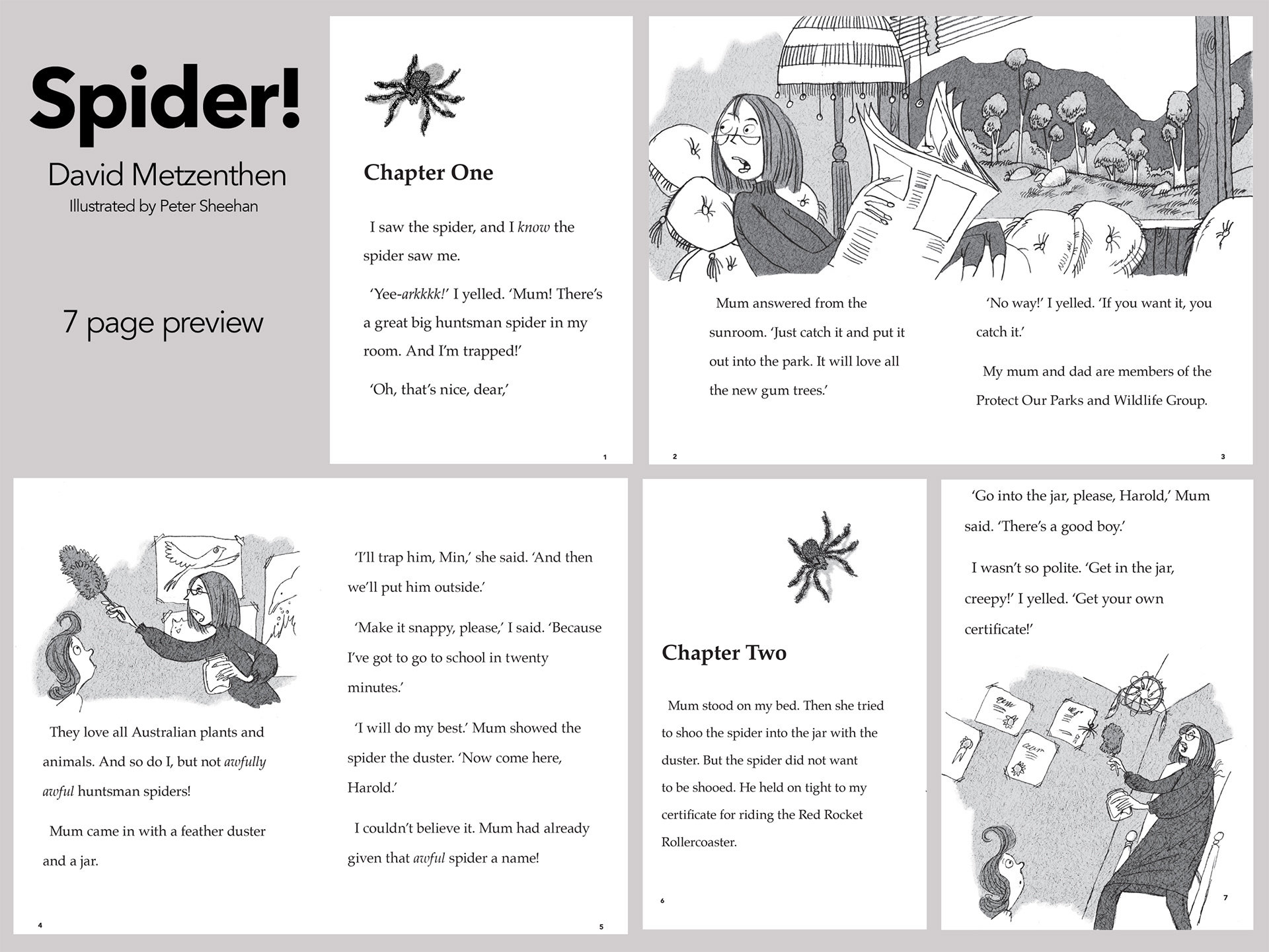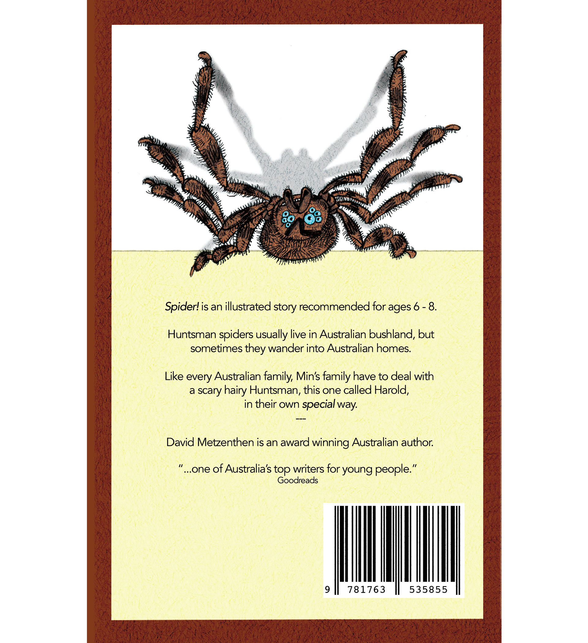 Spider! is an illustrated story recommended for ages 6 to 8. Huntsman spiders usually live in Australian bushland, but sometimes they wander into Australian homes. Like every Australian family, Min’s family have to deal with a scary hairy Huntsman, this one called Harold, in their own special way. Written by David Metzenthen and illustrated by Peter Sheehan. The story is based on a huntsman spider David Metzenthen found in his home. David and his children did catch the spider with a vacuum cleaner – and it did crawl back out! David Metzenthen is an award winning author. “...one of Australia’s top writers for young people.” – Goodreads.