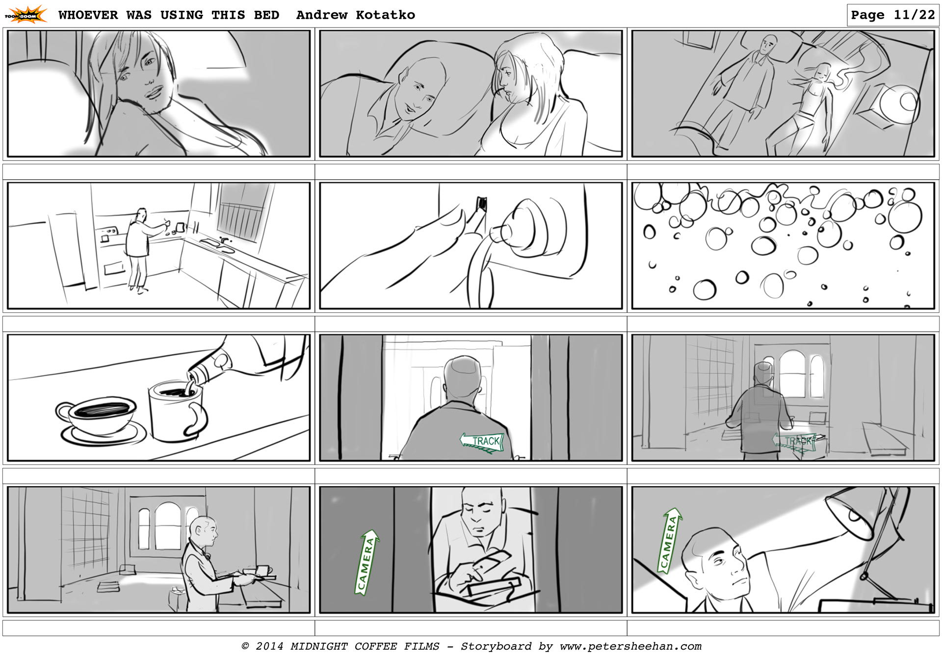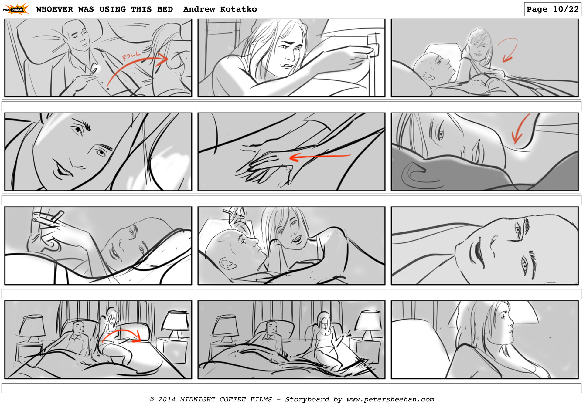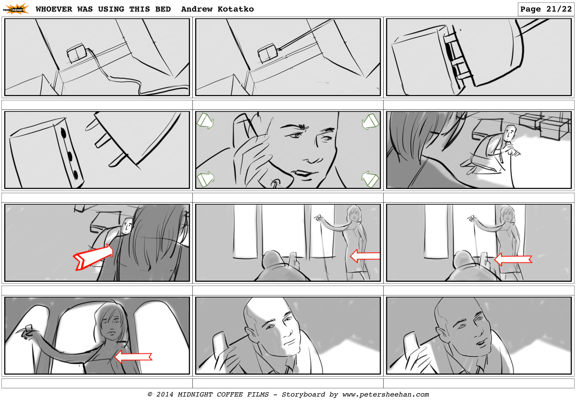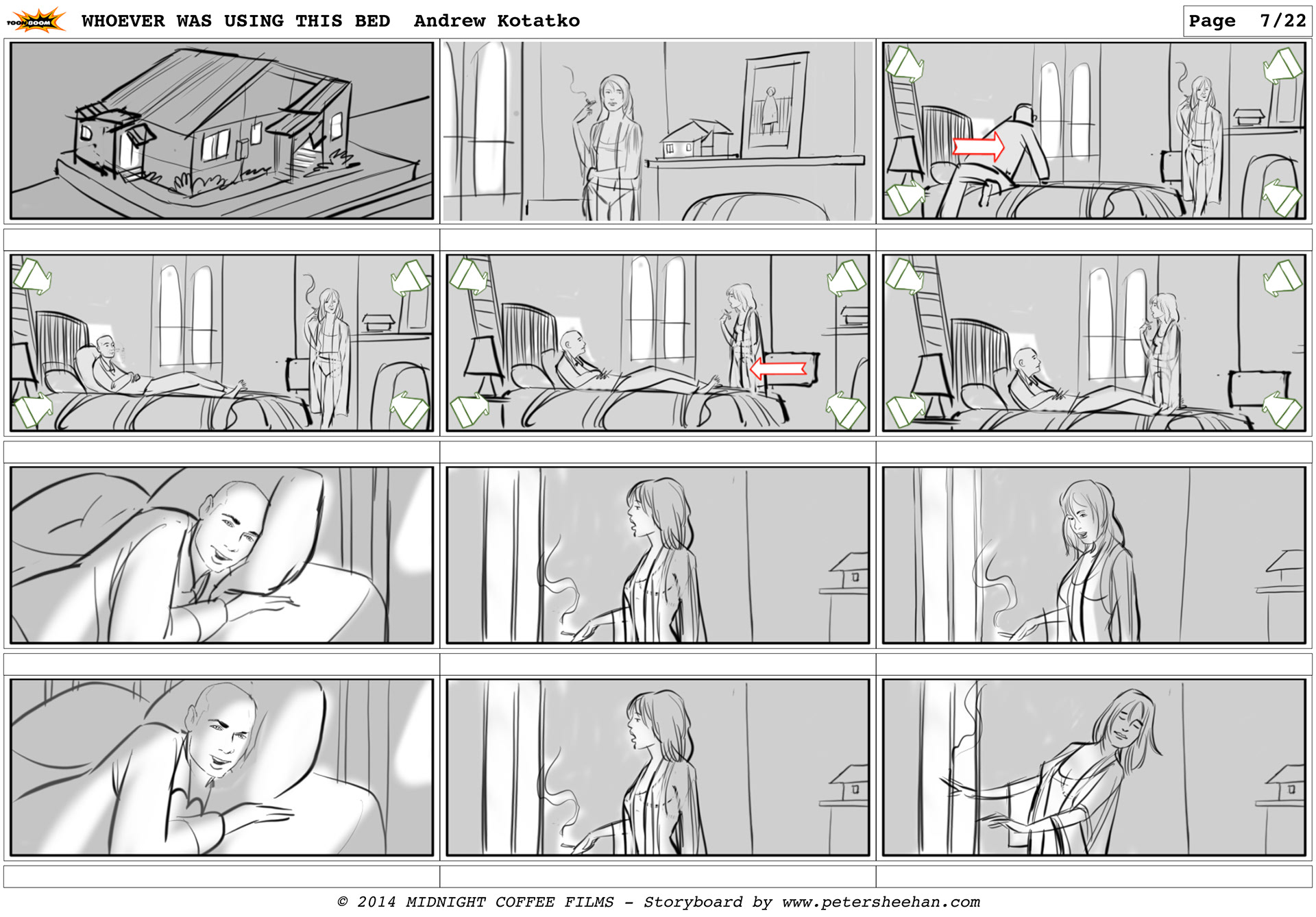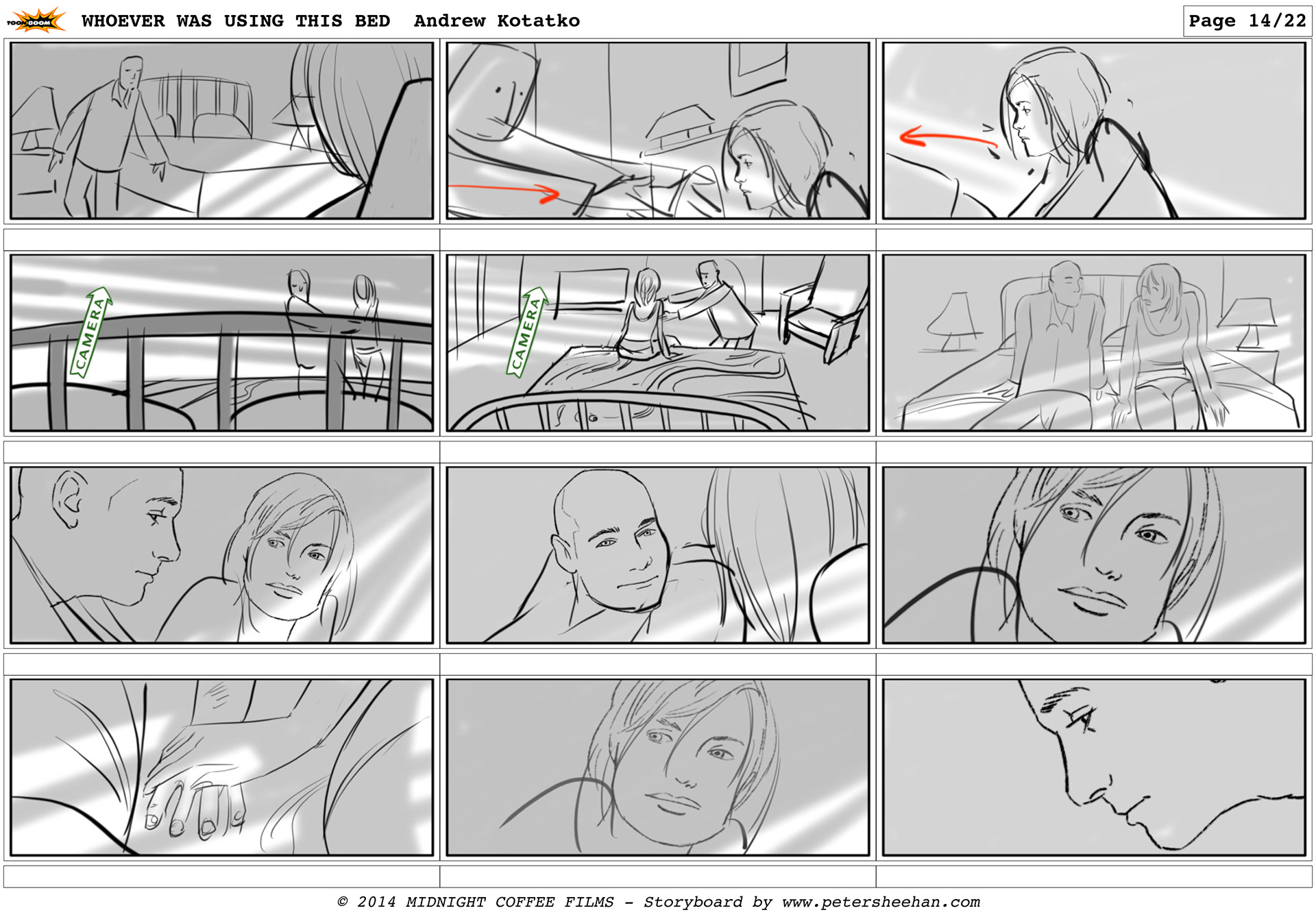The storyboard for the short film WHOEVER WAS USING THIS BED, directed by Andrew Kotatko.