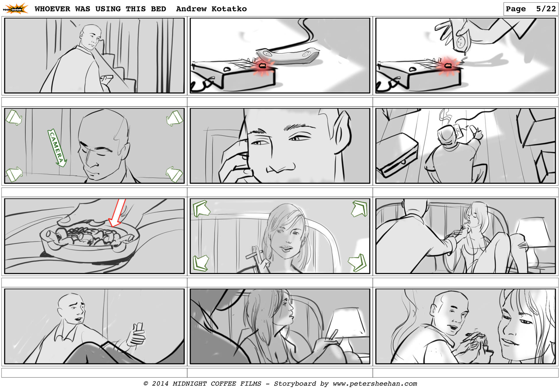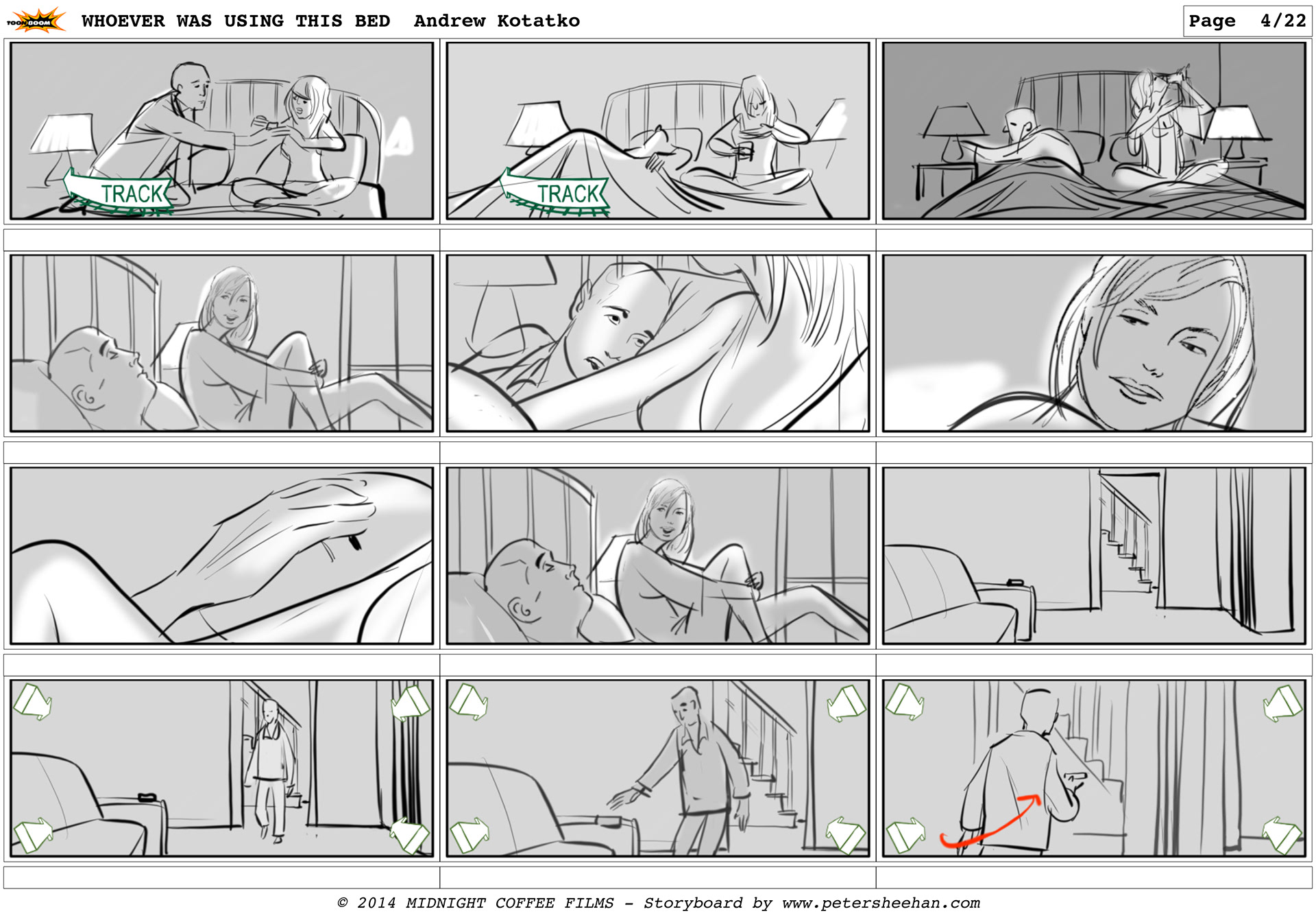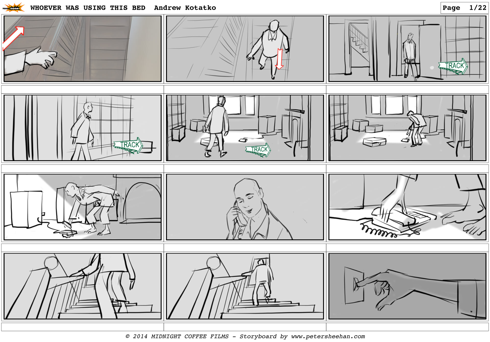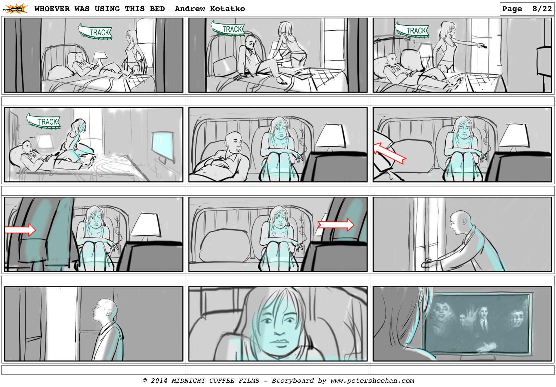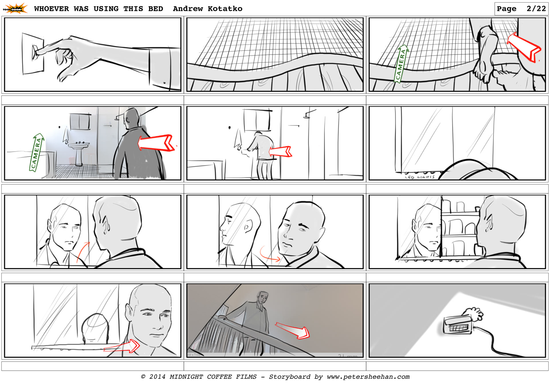 The storyboard for the short film WHOEVER WAS USING THIS BED, directed by Andrew Kotatko.