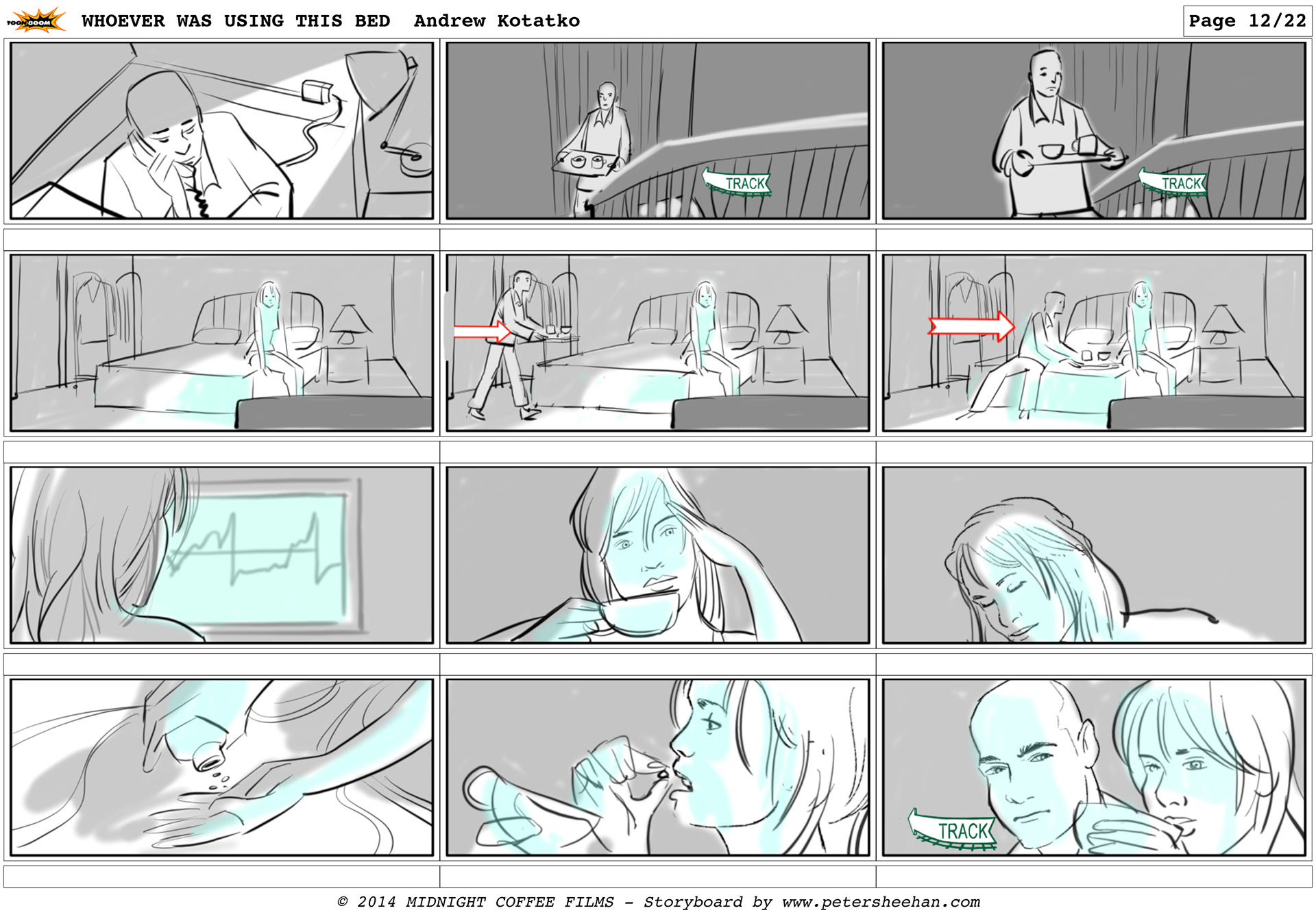 The images from the storyboard for the short film Whoever Was Using This Bed. Directed by Andrew Kotatko